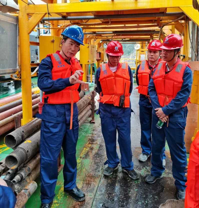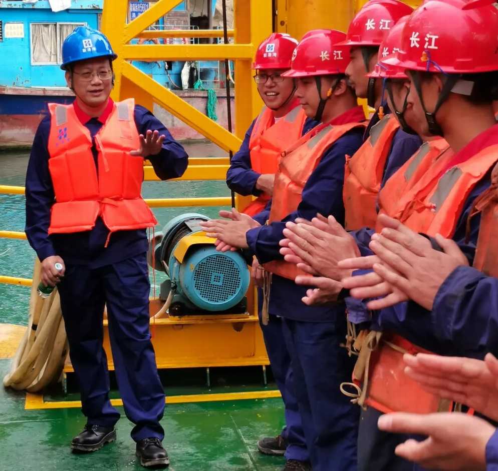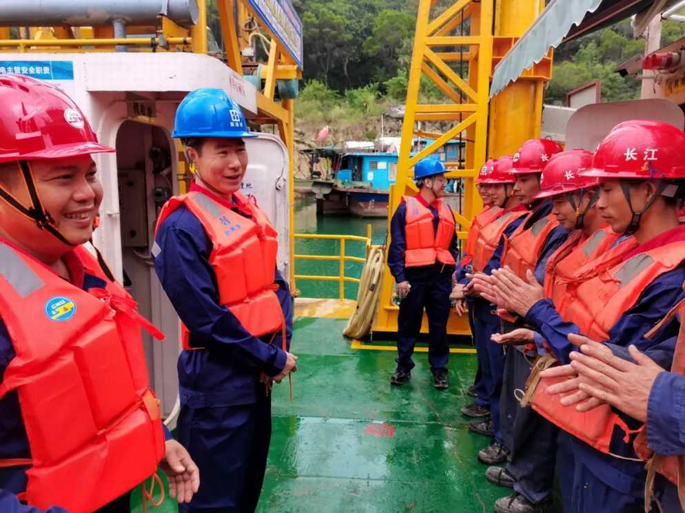 隨后寧董和姚董在項目部管理人員的陪同下來(lái)到新港灣81號船組,現場(chǎng)慰問(wèn)一線(xiàn)施工人員。寧董和姚董實(shí)地察看航段內的施工現場(chǎng),參觀(guān)了公司自主設計建造的內河炸礁船,并與船組同事深入交流探討船機設備技術(shù)和施工工藝流程。